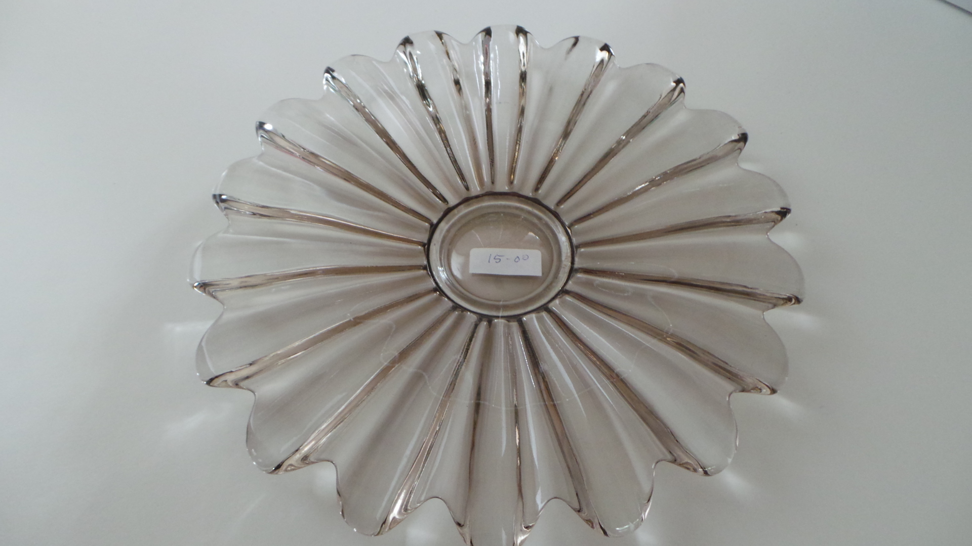 I was drawn to a dish of smokey glass in a flower shape. It reminded me of pieces I had seen labelled in an antique shop as ‘Depression glass’. I picked it up. It felt weighty in hand, and not just the heft of the glass.